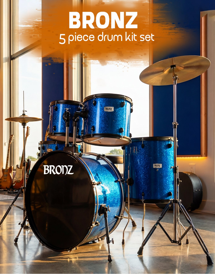 BRONZ Acoustic Drum Kit (Blue) - 5 Pc Complete Drum Set with Hardware & Throne