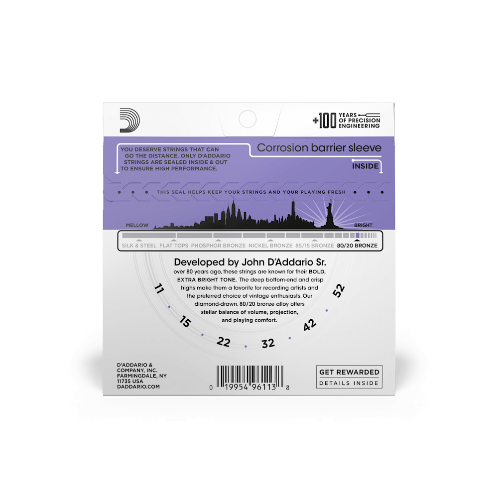 80/20 Bronze are our brightest acoustic strings, made to give your guitar an unparalleled shine. These bold sounding strings were developed by John D'Addario Sr. and guitar maker John D'Angelico in the 1930s, and have been beloved for their sparkling, trebly tone ever since. Made with a high carbon steel core and 80/20 Bronze wrap wire, 80/20 acoustic strings offer remarkable depth, along with rich, bright harmonics, and powerful projection. 12-53 Light gauge strings are our most popular acoustic gauge, providing a nice balance of playability and tone.