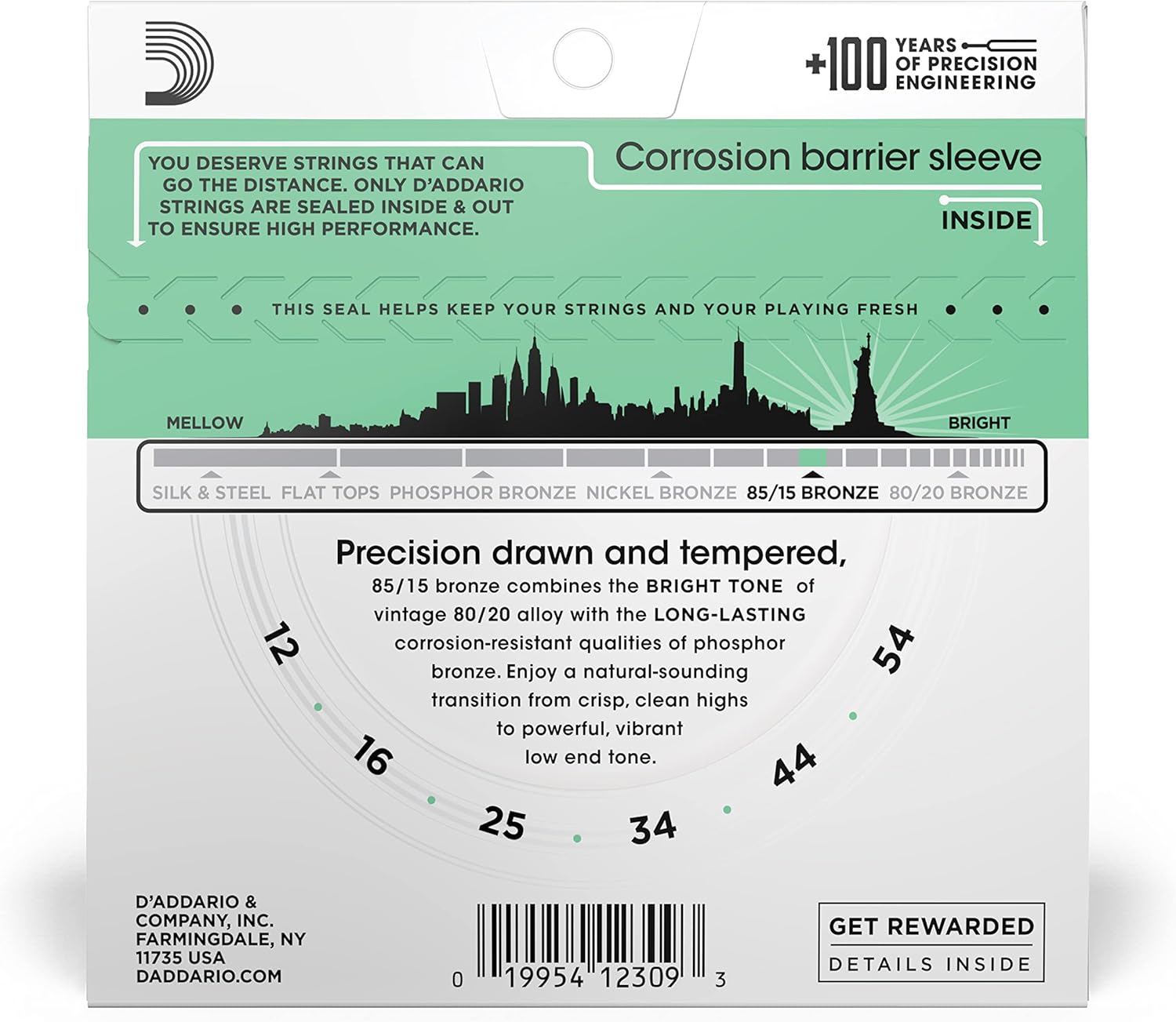 85/15 Bronze combines the brilliance of 80/20 bronze with the longer life characteristics of Phosphor Bronze. The 85/15 Bronze wrap wire is precision wound onto a carefully drawn, hexagonally shaped high carbon steel core, resulting in long lasting, bright sounding tone with excellent intonation.EZ920 strings are a D'Addario original hybrid gauge designed for players who want a balance of light gauge high strings for easy bending and medium low strings for heavy strumming.