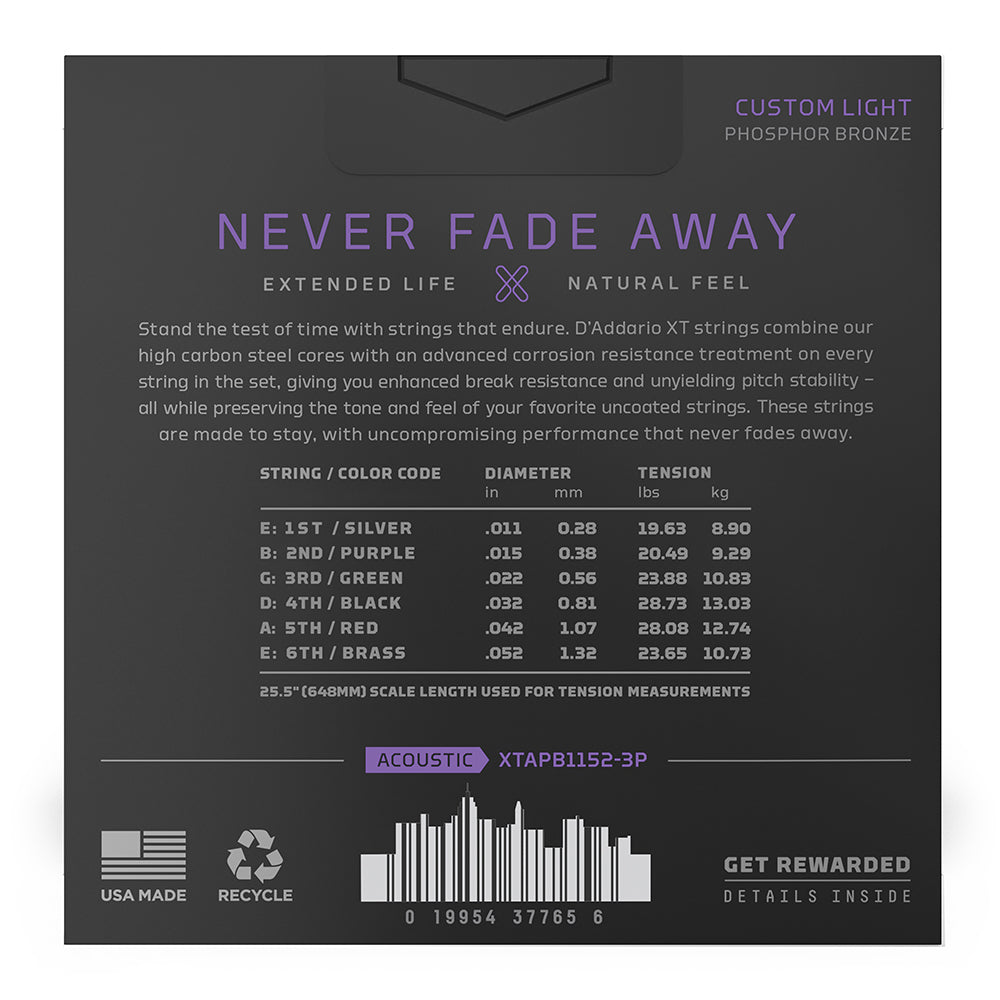 Since D'Addario introduced Phosphor Bronze acoustic guitar strings in 1974, they've been synonymous with warm, well-balanced tone. XT Phosphor Bronze offers that and more, boasting enhanced break resistance, better pitch stability, and longer life than our standard phosphor bronze strings. The XT coating delivers advanced corrosion resistance, while still retaining the warm tone and natural feel of the uncoated string. Beneath the coating, these XT acoustic strings are constructed with a NY Steel core, phosphor bronze wrap wire, and Fusion Twist technology, affording tonal versatility with added resilience, excellent for a wide range of acoustic styles. This 11-52 Custom Light gauge set has slightly more volume and projection than Extra Light, while still being easy to play.
