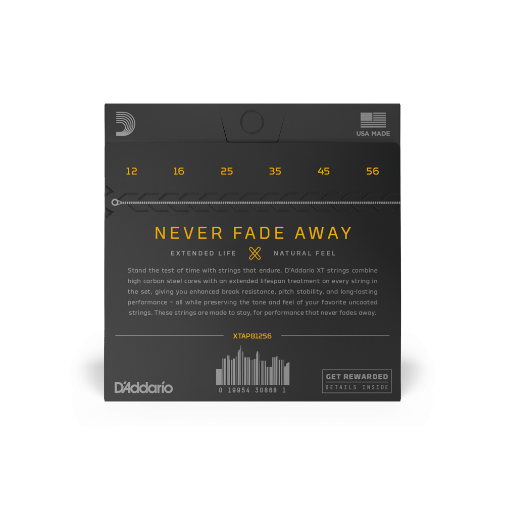 Since D'Addario introduced Phosphor Bronze acoustic guitar strings in 1974, they've been synonymous with warm, well-balanced tone. XT Phosphor Bronze offers that and more, boasting enhanced break resistance, better pitch stability, and longer life than our standard phosphor bronze strings. The XT coating delivers advanced corrosion resistance, while still retaining the warm tone and natural feel of the uncoated string. Beneath the coating, these XT acoustic strings are constructed with a NY Steel core, phosphor bronze wrap wire, and Fusion Twist technology, affording tonal versatility with added resilience, excellent for a wide range of acoustic styles. This 12-56 Light Top/Medium Bottom gauge