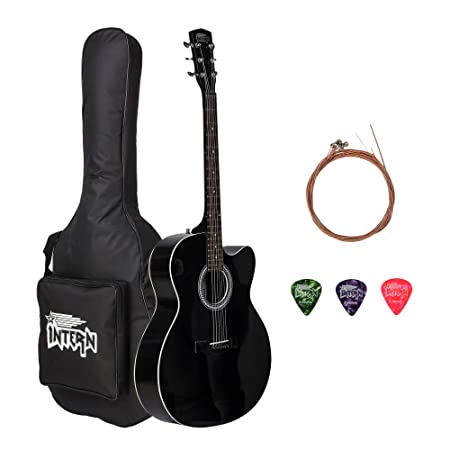 - Acoustic Guitar package. Made in India 39 inches Cutaway Acoustic 6 string Folk Guitar with dual sides adjustable truss Rod. Durable and long lasting with Carry bag, strings, picks and Allen key.