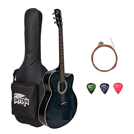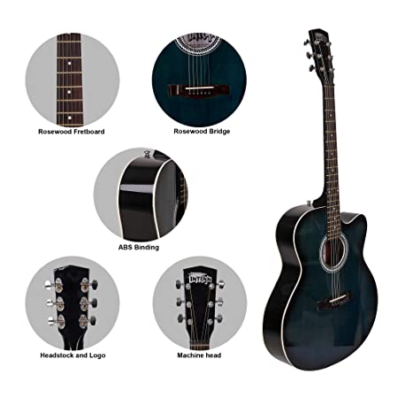- Acoustic Guitar package. Made in India 39 inches Cutaway Acoustic 6 string Folk Guitar with dual sides adjustable truss Rod. Durable and long lasting with Carry bag, strings, picks and allen key.